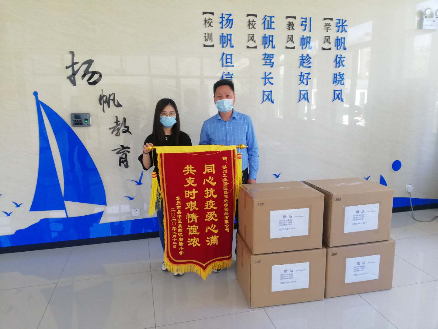 病毒無情,人間有愛。當前,新冠病毒疫情牽動著每一個人的心,吳淞江實驗小學的學生、家長也在一直關注著學校的疫情防控情況,學校作為人員密集的場所,在防疫物資十分緊缺的形勢下,5月12日上午,吳淞江實驗小學一(6)班廉政同學的爸爸向學校無償捐贈4箱共1000副防護面屏 ,用于支援學校復學后新型冠狀病毒防控工作。尤偉清校長、朱建忠主席、金葉老師參加了捐贈儀式。